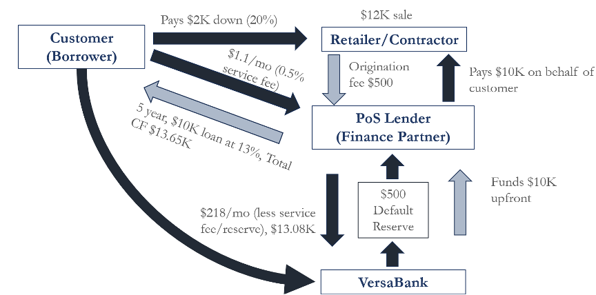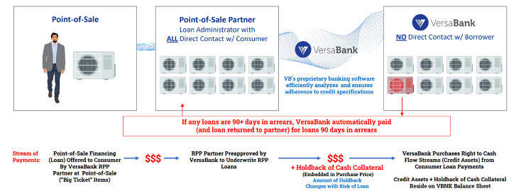 VersaBank’s RPP funding model creates a rare win–win–win ecosystem for consumers, finance partners, and, of course, VersaBank itself. Rather than competing directly for retail customers, VersaBank’s RPP provides funding to finance companies (partners) who extend point-of-sale (PoS) loans and leases to consumers for items like home HVAC systems, pools, appliances, etc. Importantly, VersaBank purchases the cash flow streams from these consumer loans at par (versus ~75% from conventional sources) by supplying the PoS partner with upfront capital. The PoS partner, the loan administrator, keeps the loans on its balance sheet, continues to service the loans, and maintains the customer relationship, while VersaBank earns the interest payments with minimal administrative overhead.