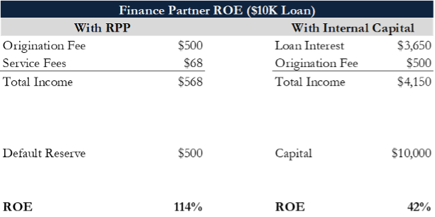 Finance partners are transformed into originators or servicers, with a greater ROE than they’d experience using internal capital. The retailer’s finance partner gets paid immediately (at par or better) for the loans it originated, thereby generating cash flow from origination and servicing the loan. The finance partner can massively amplify its ROE by originating more loans with the freed-up capital. Since the loan stays on the balance sheet, PoS partners’ increased scale gives them access to cheaper funding from other sources, as well as improved data advantages and commercial credibility.