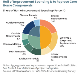 The U.S. housing market is defined by aging stock, with the average home nearly 44 years old. This drives ongoing demand for big-ticket replacements. Together these items represent roughly 50% of a $400 billion market, as shown below.