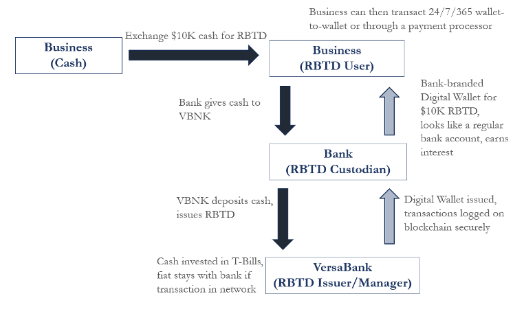 When a U.S. bank’s customer purchases RBTD tokens (representing U.S. dollar deposits), the underlying funds are placed with VersaBank to back those tokens.