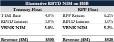 Presented below are two possible NIMs for RBTDs assuming 1% interest rate (though most deposit accounts are ~0.1%), on $10 billion in total deposits.