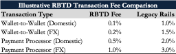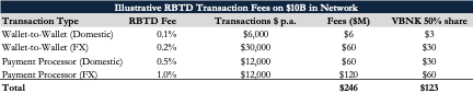 Should VersaBank sit at the center of a RBTD network as the issuer and settlement anchor, it can also generate considerable earnings by managing the capital flows in the system. Even with lower fees than competing payment rails, and sharing 50% of the fees with partners, these earnings amount to billions in transaction volume. A generalized RBTD fee schedule is detailed below.