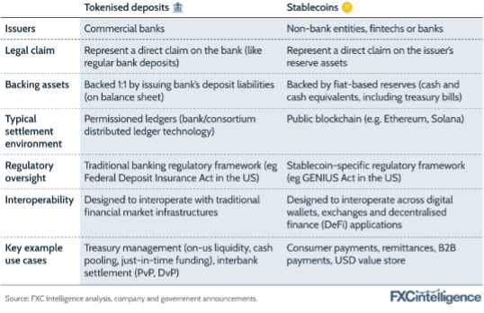 A comparison of tokenized deposits versus stablecoins is shown below.